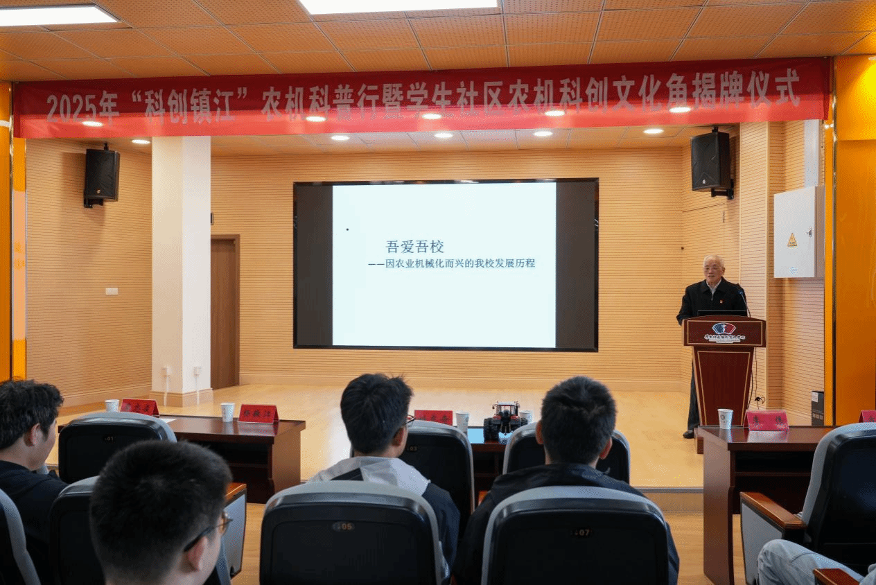 11月5日,由镇江市科学技术协会主办,泓江书院、产学研合作处、农业工程学院、环境与安全工程学院、机械工程学院、档案与博物馆承办的2025年“科创镇江”农机科普行暨学生社区农机科创文化角揭牌仪式在学苑楼305报告厅隆重举行。校党委常委、组织部部长、泓江书院院长杨敬江,镇江市科学技术协会副主席刘志奇,原江苏理工大学农业机械学院党总支书记李国文出席活动。泓江书院、农业工程学院、档案与博物馆等部门负责人,农业工程学院同学、书院师生代表共同参与。