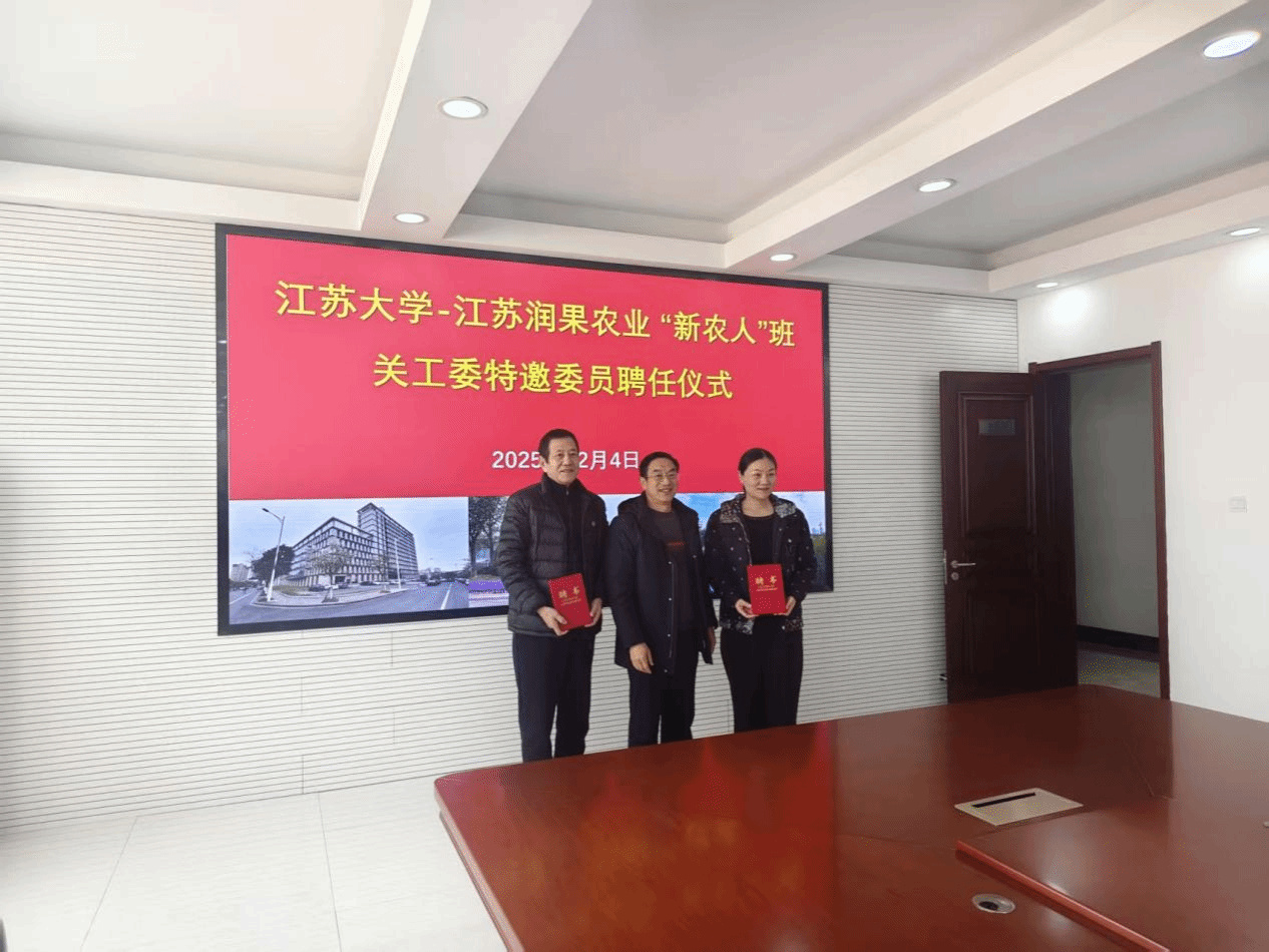 为深入贯彻国家关于新时代人才培养与乡村振兴的战略部署,创新校企协同育人机制,充分发挥关工委在立德树人、连接校园与社会中的桥梁纽带作用,2025年12月4日,江苏大学—江苏润果农业“新农人”班关工委特邀委员聘任仪式在江苏润果农业发展有限公司隆重举行。农业工程学院党委书记廖志凌,党委副书记、副院长周军,学业导师路欣老师、杨德勇老师,江苏润果农业发展有限公司董事长魏云烽、董事长魏巧及“新农人”班相关企业负责人共同出席仪式。